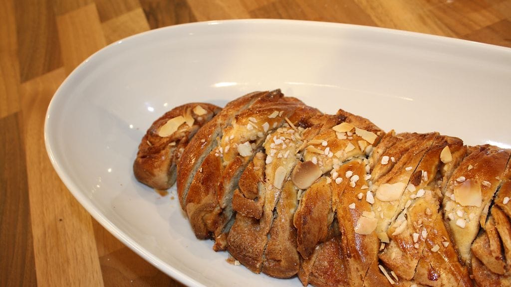 Kauli taikina levyksi ja voitele voilla sekä ripottele pinnalle kanelia ja sokeria. Rullaa taikina. Leikkaa saksilla sentin paksuisia viipaleita, jotka ovat alaosastaan kiinni. Kääntele viipaleet kävyn muotoon. Anna kohota ja voitele kananmunalla sekä ripottele raesokeria päälle. Paista 200-asteisessa uunissa noin 20-25 minuuttia.