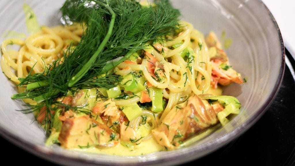 Huuhtaise ja pilko purjo ja paista sitä voissa kevyesti. Älä ruskista. Lisää curryjauhe ja kypsennä hetki, kunnes purjo pehmenee hieman. Lisää kerma ja keitä kastiketta kokoon noin 5 minuuttia. Sekoita lohipalat varovasti joukkoon. Viimeistele ranskankermalla, sitruunamehulla ja tillisilpulla. Mausta pippurilla ja tarvittaessa suolalla.