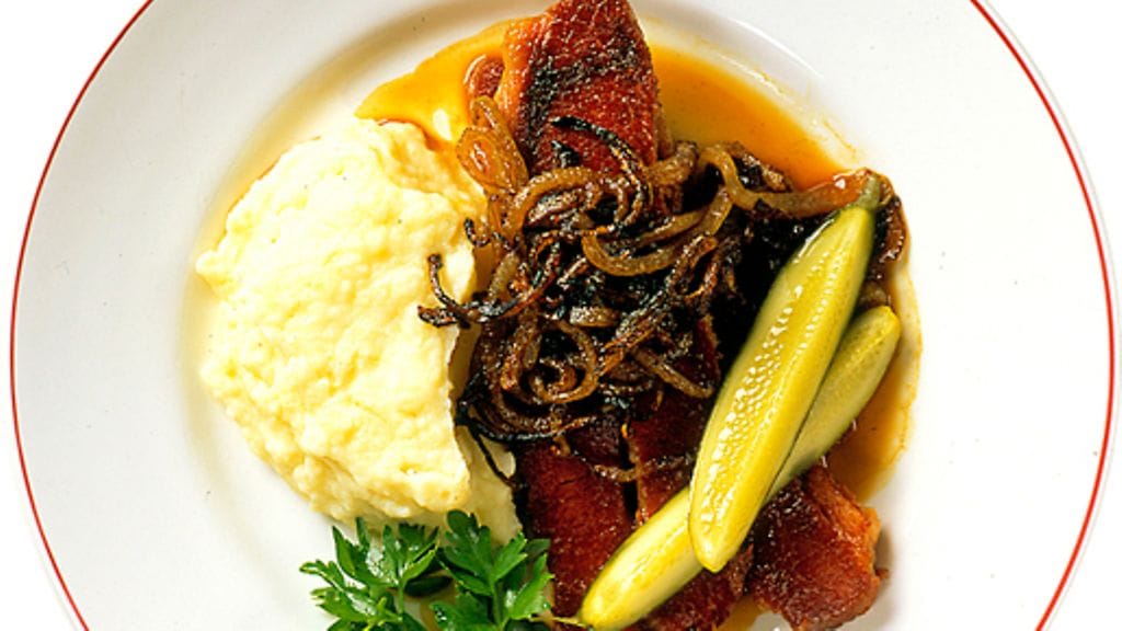 3. Kuori ja viipaloi sipulit. Ruskista 1 rkl voita keskilämmöllä ja paista sipulit rapeiksi. Viipaloi liha paksuiksi viipaleiksi ja käristä ne nopeasti ruskistuneessa voissa, niin että lihapalat saavat väriä ja kuumenevat kauttaaltaan. Tarjoile perunapyreen ja sipulin kera.