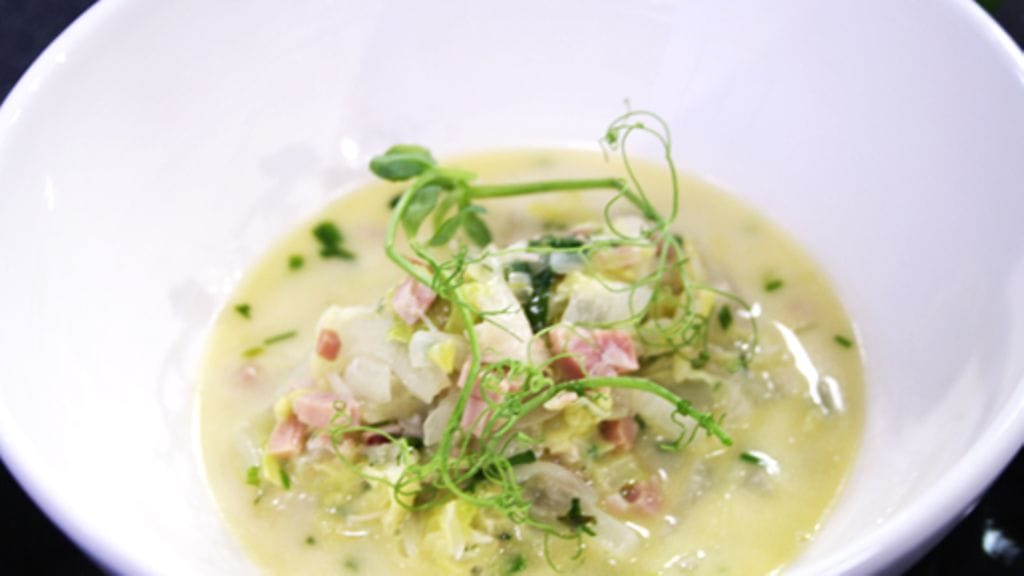 Leikkaa kiinankaali hienoksi ja lisää edelliseen. Hienonna persilja ja lisää keiton joukkoon. Lisää viimeisenä smetana.