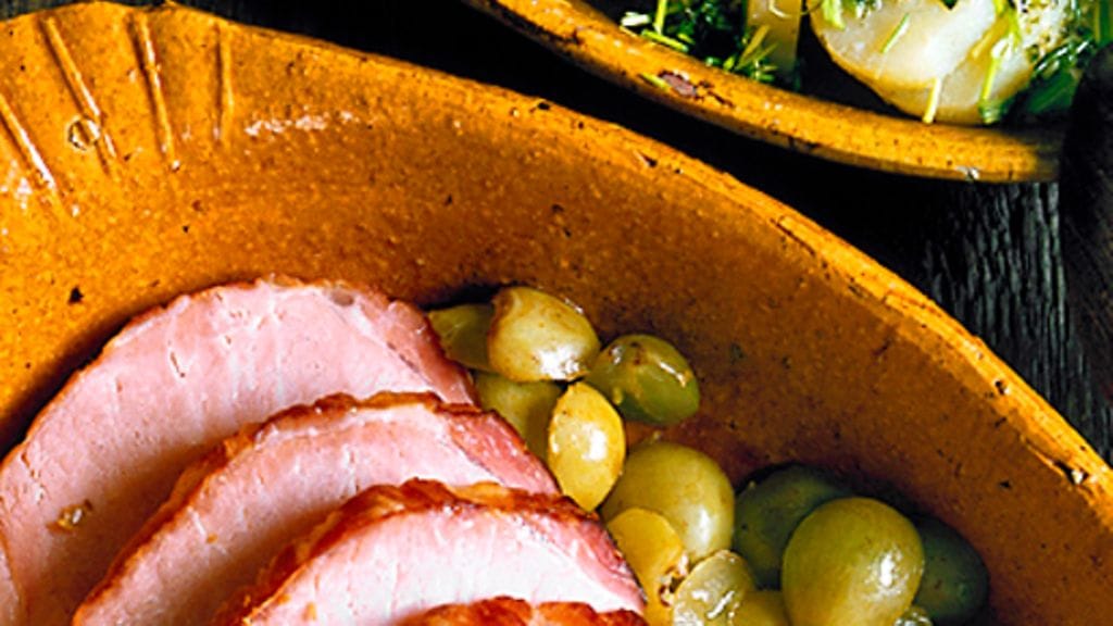 2. Aseta kasslerviipaleet uunivuokaan. Halkaise rypäleet ja poista siemenet, laita vuokaan. Kaada päälle viini. Laita uuniin kunnes liha on lämmennyt.