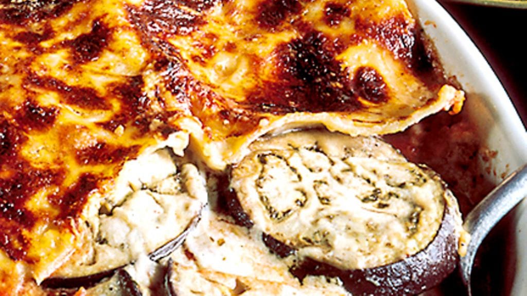 5. Kaada valkokastiketta uunivuoan pohjalle, lado sen päälle 3-4 lasagnelevyä, vuorottele sitten munakoisoa, tomaattikastiketta, juustoraastetta ja lasagnelevyjä. Viimeiseksi tulee lasagnelevyjä, valkokastiketta ja juustoraastetta. Paista uunissa noin 40 minuuttia.