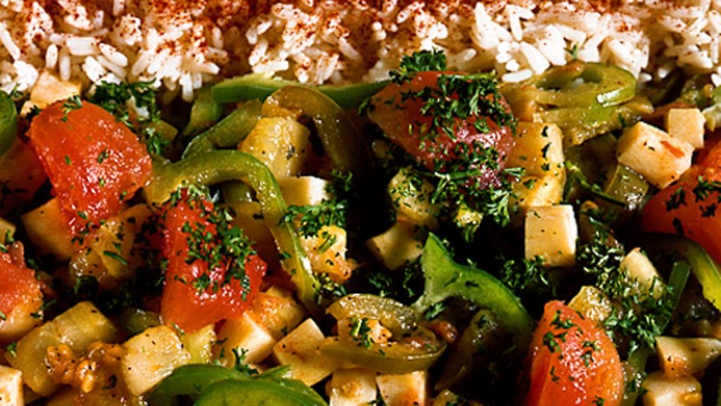 2. Kuumenna öljy padassa. Laita kaikki vihannekset pataan ja mausta. Keitä hiljalleen kannen alla kunnes kaikki tuntuu sopivan pehmeältä. Tarjoile riisin kera.