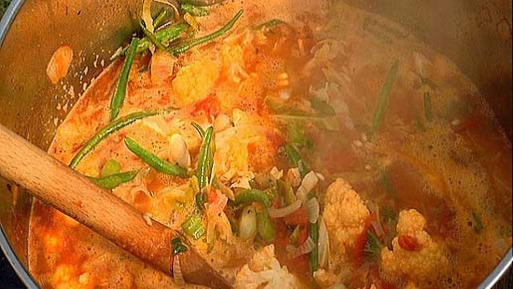 3. Lisää vettä niin että kaikki kasvikset peittyvät. Keitä hiljaisella tulella ja lisää hetken kuluttua kaali, kukkakaali, vihreät pavut ja tomaatit. Lisää vettä ja keitä noin 15 minuuttia.