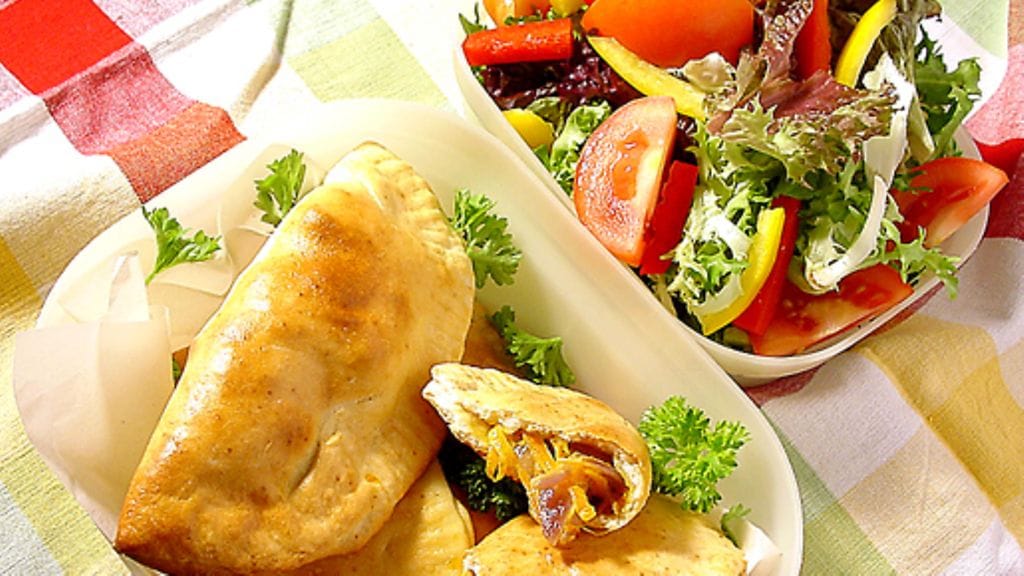 2. Kuumenna uuni 200 asteeseen. Sekoita pizzapohja-ainekset pakkauksen ohjeen mukaan. Jaa valmis taikina 6 yhtä suureen osaan, kaulitse pyöreiksi. Laita iso ruokalusikallinen täytettä jokaiselle pohjalle ja taita piirakka kaksinkerroin. Paina reunat kiinni toisiinsa haarukalla.