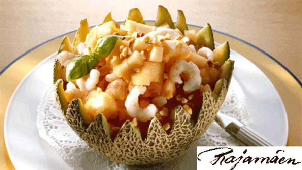 Tarjoa salaatti tyhjäksi koverretusta meloninkuoresta. Ripottele salaatin päälle pähkinärouhetta koristeeksi.