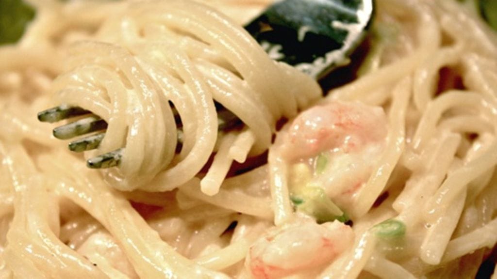 4. Kun spagetti on valmis, kaada vedet pois, pidä liesi päällä, lisää spagetin sekaan katkaravut ja kermaseos sekä juustot. Anna spagettiseoksen lämmetä, jotta kastike paksuuntuu.