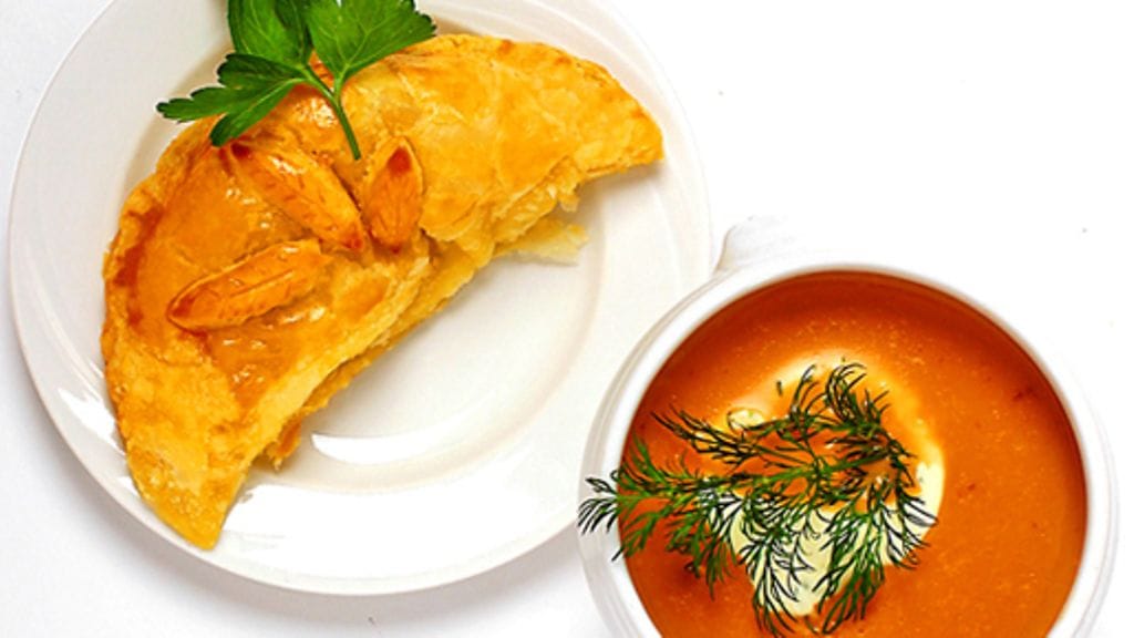 4. Keitto: Kuori ja hienonna sipuli, valkosipuli ja porkkana. Paista kasvikset öljyssä isossa kattilassa. Lisää tomaattipyree ja sekoita, puuteroi päälle jauhot ja kääntele seosta. Kaada päälle liemi ja alenna lämpöä. Laita kansi päälle ja keitä miedolla lämmöllä 10 minuuttia.