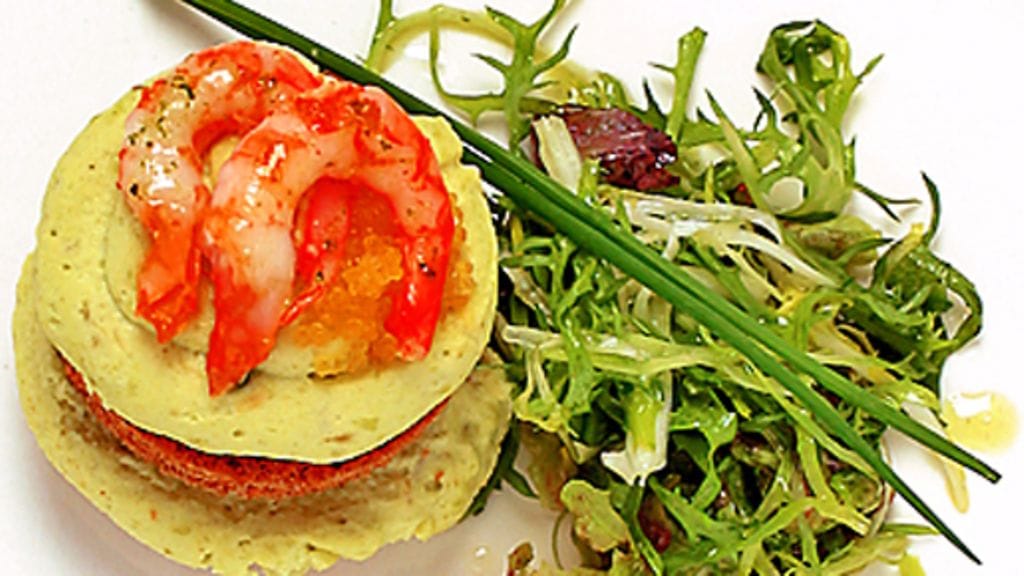 3. Paina muotilla leivistä pyörylöitä ja paista ne rapeiksi voissa. Kerrostele leipäpyörylät avokadokreemin kanssa, viimeiseksi avokadoa. Koristele katkaravuilla ja mädillä. Asettele kauniisti salaatin vierelle ja tarjoile heti.