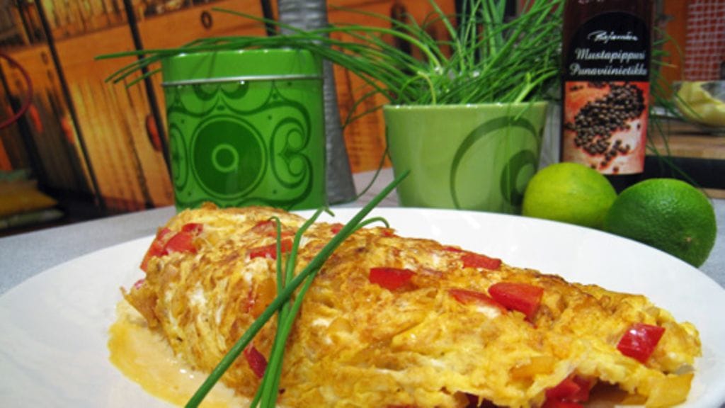 Suikaloi paprika ja hienonna sipuli. Riko kananmunat kulhoon ja lisää joukkoon vesi. Mausta seos suolalla ja pippurilla.