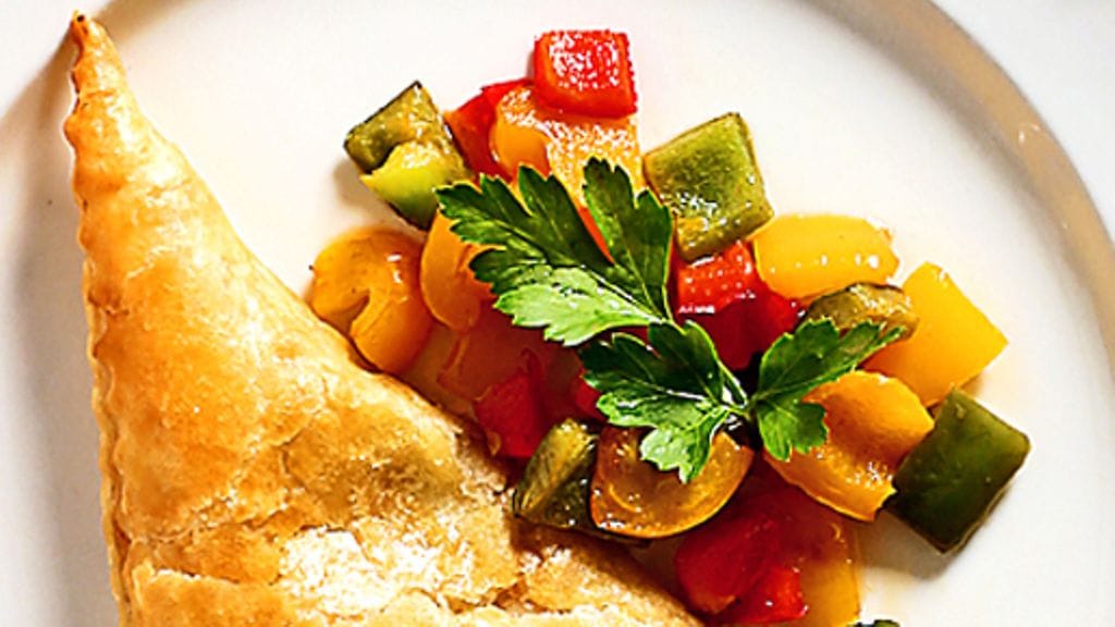 3. Nosta piiraat uunipedille. Voitele yläpuoli vatkatulla munalla ja paista piiraat uunissa kullanruskeiksi. Koristele paprikalla ja sitruunamelissalla.