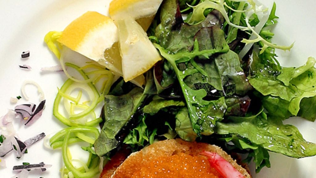 3. Kuori katkaravut. Ota leipäviipaleista muotilla pyörylöitä ja paista ne voissa kullanruskeiksi. Levitä avokadotäyte neljälle leipäpyörylälle ja pane loput pyörylät päälle kanneksi. Koristele katkaravuilla ja mädillä. Tarjoa lisänä yrttiöljyllä maustettuja salaatinlehtiä.