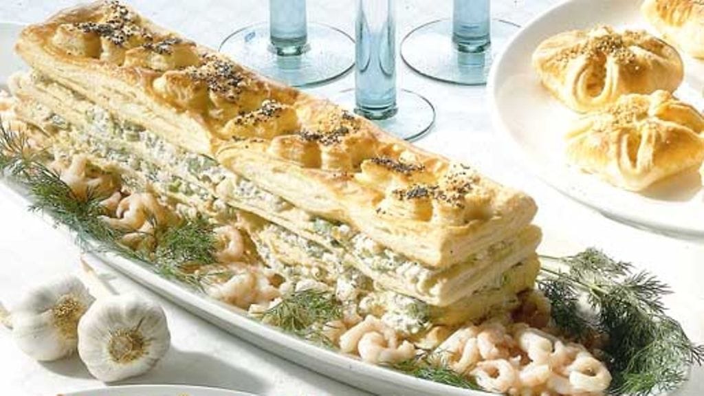 Valmista sillä aikaa täyte. Liuota liivatelehtiä ensin hetki kylmässä vedessä ja liuota ne sitten 1 dl:aan kiehuvaa maitoa. Silppua purjosipuli ja sekoita kaikki täytteen ainekset keskenään. Lisää maito-liivateseos täytteeseen.