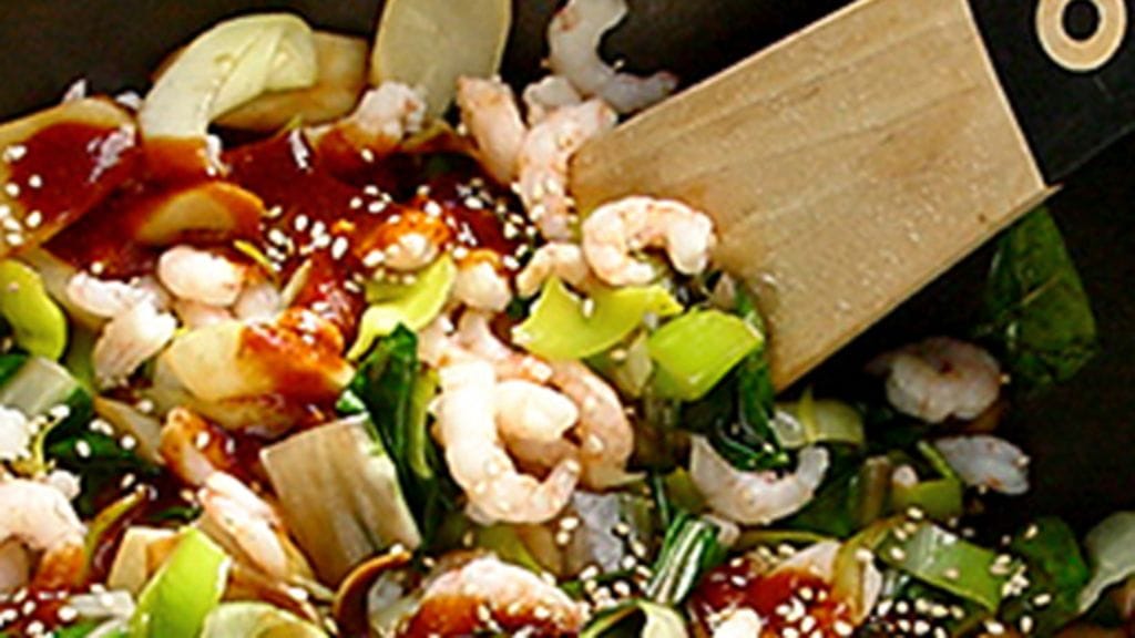 3. Kuumenna öljy wokki- tai paistinpannussa. Paista mustajuuria ja valkosipuleita muutama minuutti. Lisää sekoittaen purjo ja mangoldi. Sekoita viimeiseksi joukkoon katkaravut ja kaada kastike päälle. Tarjoile nuudelit ohessa, tai kääntele ne muiden ainesten joukkoon. Sirottele päälle seesaminsiemeniä ja korianterinlehtiä.