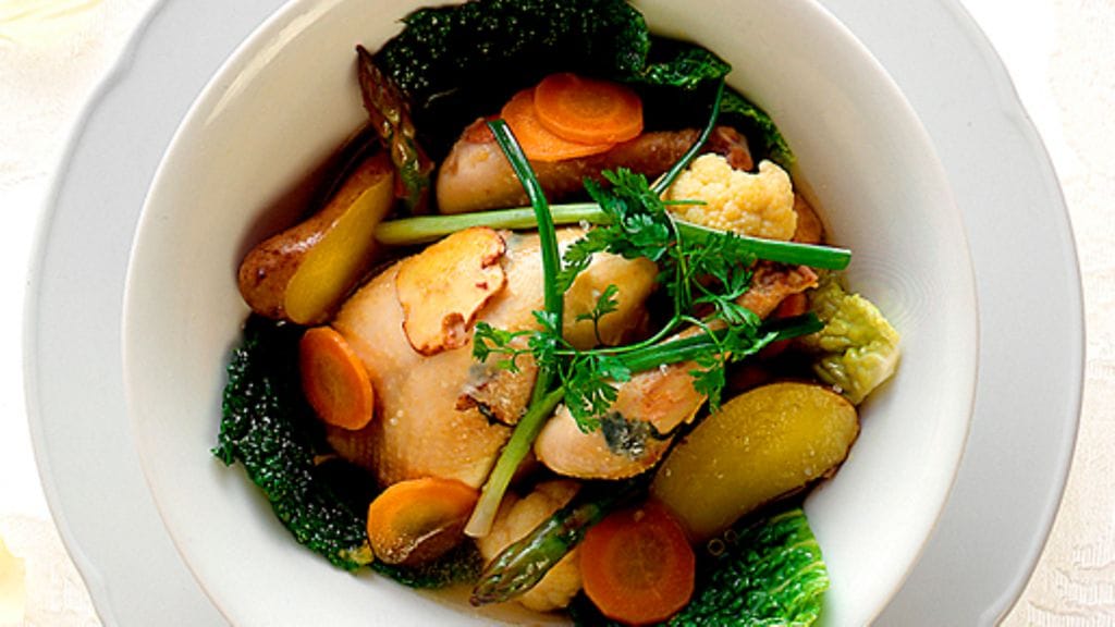 3. Keitä toisessa kattilassa vettä ja ryöppää savoijinkaalin lehtiä siinä puoli minuuttia. Huuhtele ne sen jälkeen nopeasti kylmässä vedessä. Vuoraa lämmin keittokulho savoijinkaalilla. Nosta niiden päälle broileri ja vihannekset. Kaada liemi päälle ja korista persiljalla. Leikkaa broileri vasta pöydässä ja tarjoa jokaiselle kanapaloja, vihanneksia ja lientä syviltä lautasilta.