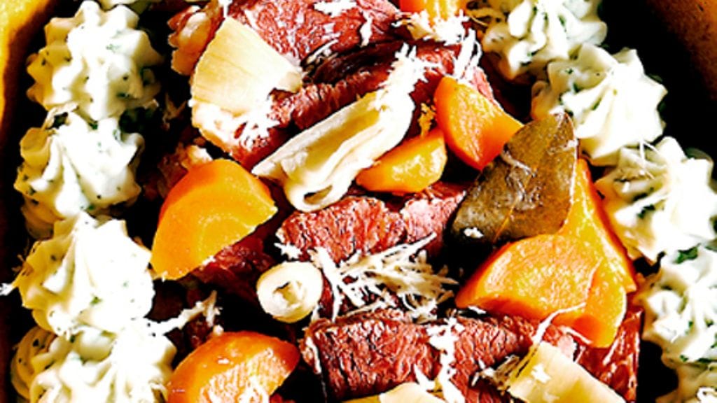 1. Keitä kattilassa sen verran vettä, että arvioit sen peittävän lihan. Nosta liha kiehuvaan veteen ja lisää liemikuutio. Kuumenna uudelleen kiehuvaksi, kuori vaahto tarkoin ja lisää mausteet ja vihannekset. Keitä hiljaa kannen alla, kunnes liha tuntuu oikein murealta, runsas 2 tuntia.