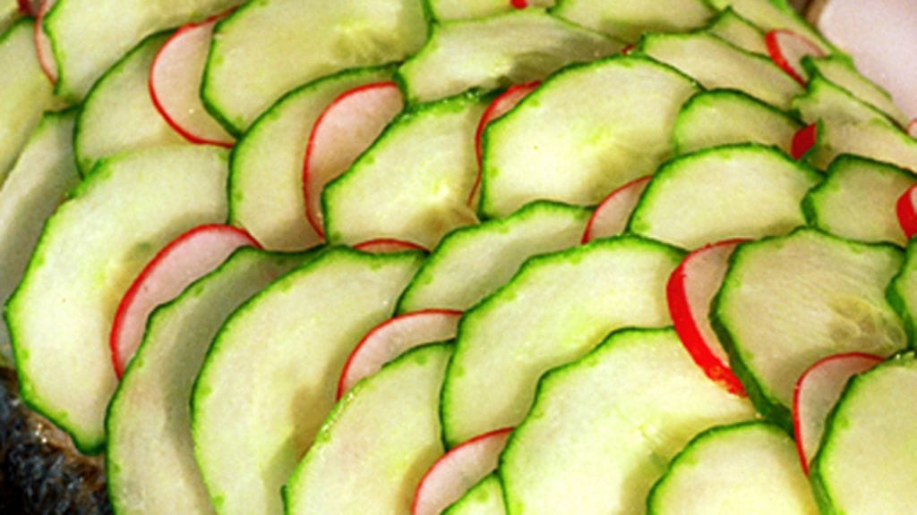 3. Jos tarjoat lohen kylmänä, jäähdytä se liemessään. Kun se on jäähtynyt, nosta liemestä ja vedä nahka irti. Liuota liivatelehdet tilkassa keitinlientä. Penslaa lohi liivateliuoksella. Koristele ohuilla kurkku- ja retiisiviipaleilla kuin suurilla suomuilla ikään. Säilytä kylmässä tarjoiluun asti.