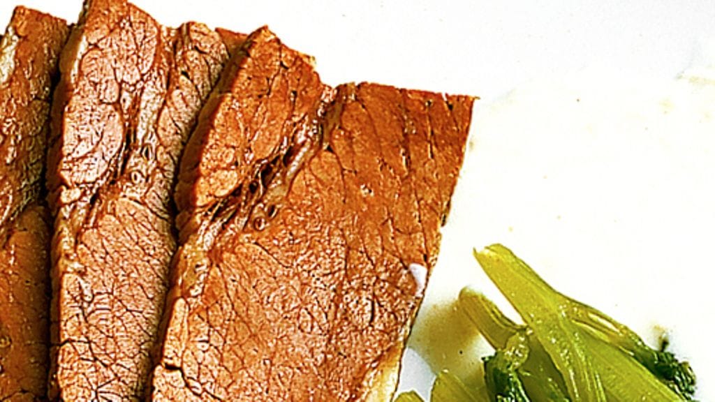 1. Kuori sipulit. Huuhdo ja puhdista purjo. Kuori porkkanat, palsternakat ja selleri. Pilko sipulit ja juurekset pienemmiksi. Laita häränrinta kylmään veteen ja kuumenna kiehuvaksi. Kaada pois vesi, lisää uutta vettä, suolaa kevyesti, lisää pippurit ja kuumenna taas kiehuvaksi. Anna kiehua hiljalleen 2 tuntia. Lisää sipuli ja kasvikset. Keitä kunnes härkä on mureaa ja vihannekset juuri ja juuri pehmeitä. Nosta liha varovaisesti reikäkauhalla ja anna jäähtyä, anna lihan levätä kahden lautasen välissä painon alla yön yli. Siivilöi liemi kulhoon ja säästä vihannekset. Säilytä kaikki ainekset viileässä yön yli.