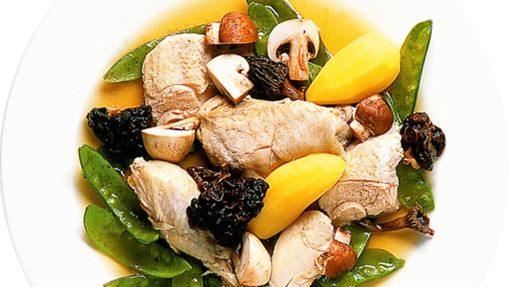 3. Nosta broileri kattilasta ja leikkaa siitä reisipalat, siipipalat ja neljä rintapalaa. Nosta kunkin ruokailija lautaselle kaksi palaa ja tarjoa lisänä sieniä, sokeriherneitä ja perunoita.