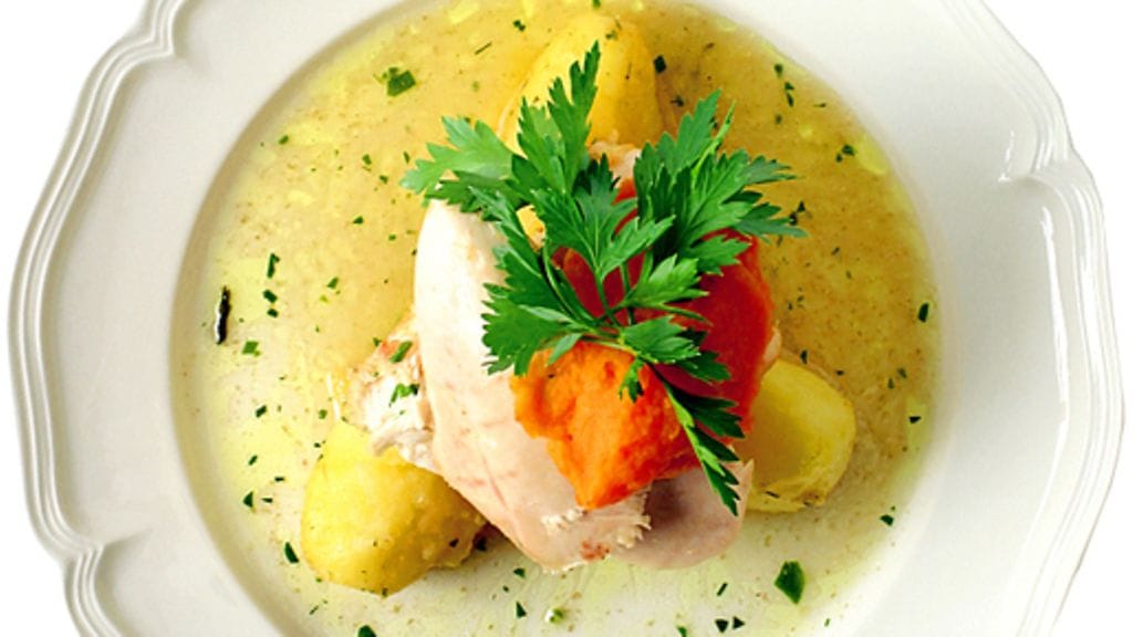 3. Paloittele kananpoika annospaloiksi, viipaloi liha isoiksi, viistoiksi viipaleiksi. Asettele viipaleet keitettyjen perunoiden kera lautasille ja kaada päälle persiljalientä. Aseta juurespyreetä lautasille ja koristele lehtipersiljalla.