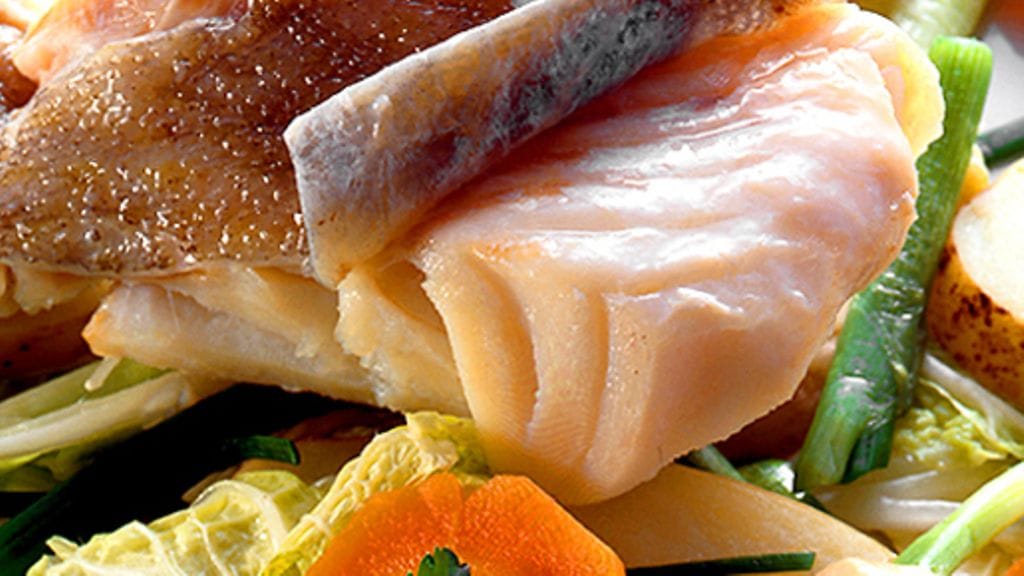 3. Laita turska ylösalaisin käännetylle lautaselle kattilaan. Kaada kattilaan hieman vettä ja höyrytä kala kannen alla, mutta vahdi, ettei vesi kiehu liian kovaa. Kala on valmis 8-10 minuutin kuluttua, sisälämpötilan tulee olla 58 astetta. Tarjoile heti vihannesten ja lehtipersiljan kanssa.