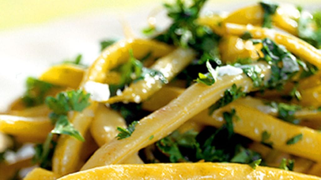 3. Laita pavut takaisin tyhjään kattilaan ja lisää voi. Tarjoile lämpimältä vadilta sipulin ja persiljan kera. Ripottele päälle hiutalesuolaa.