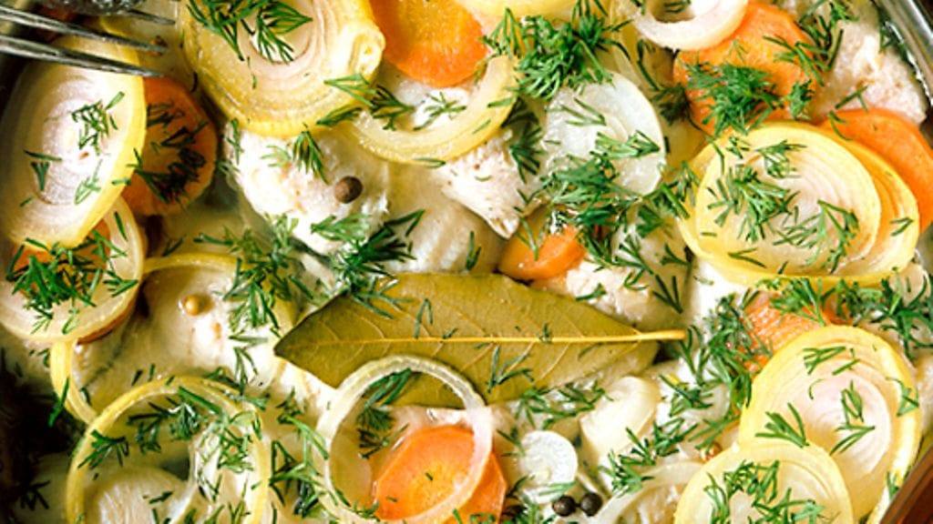 1. Kääri kalat rullalle pyrstöstä alkaen, lihapuoli ulospäin. Laita rullat tiiviisti matalaan pataan.