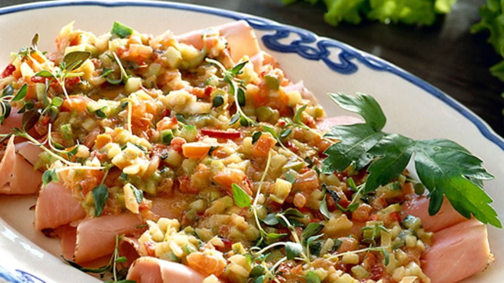 3. Kääri kinkkuviipaleet kauniisti rullalle ja asettele ne tarjoiluvadille. Kaada kastike niiden päälle ja sirottele pinnalle freesatut vihanneskuutiot. Koristele tuoreilla yrteillä.