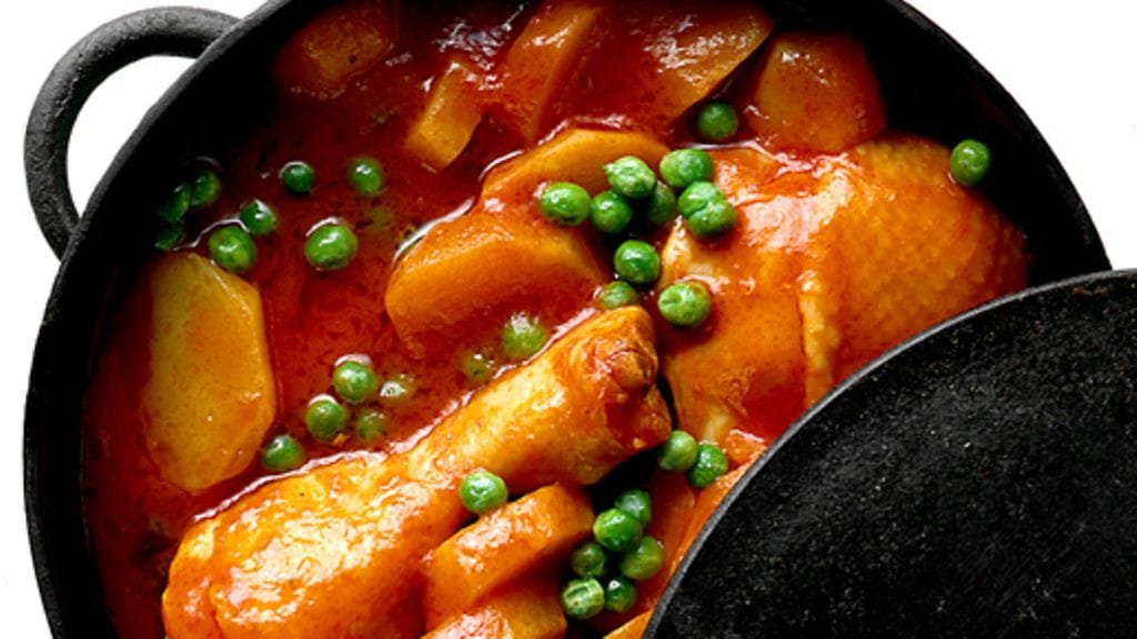 2. Kuumenna öljy padassa, jossa koko ruoan voi valmistaa. Ruskista kanapalat öljyssä kauniinvärisiksi, lisää sipulilohkot ja anna niiden ruskistua kultaisiksi. Kaada päälle liemi ja tomaatit liemineen, mausta suolalla, pippurilla ja valkosipulilla. Kuumenna kiehuvaksi, anna poreilla hiljalleen 15 minuuttia.