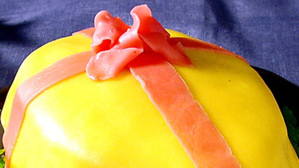 3. Torttu: Leikkaa torttupohjapalat munanmuotoiseksi. Kaulitse marsipaani ohueksi, kaulitse marsipaania myös nauhoja ja rusettia varten. Vatkaa kerma. Sekoita puolet kermavaahdosta vaniljakreemin kanssa. Levitä vadelmahilloa yhdelle torttupohjista. Levitä vaniljakermaa päälle, lisää torttupohja ja toista prosessi. Levitä loput kermavaahdosta koko tortun ympärille. Asettele marsipaanikansi päälle. Koristele.