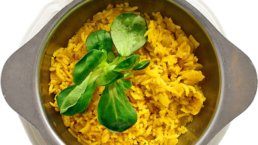 Värjää riisi keltaiseksi! Helpoiten teet sen kurkumalla, joka antaa riisille myös miedon aromaattista makua. Tuplaa resepti jos ruokailijoita on paljon. Keltainen riisi näyttää kauniilta myös seisovassa pöydässä.