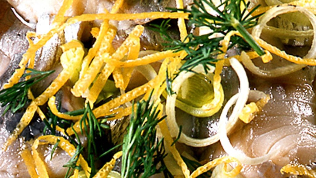 3. Kaada liemi sillin päälle, koristele sitruunankuorella, purjolla ja tillillä. Anna vetäytyä kylmässä muutama tunti.