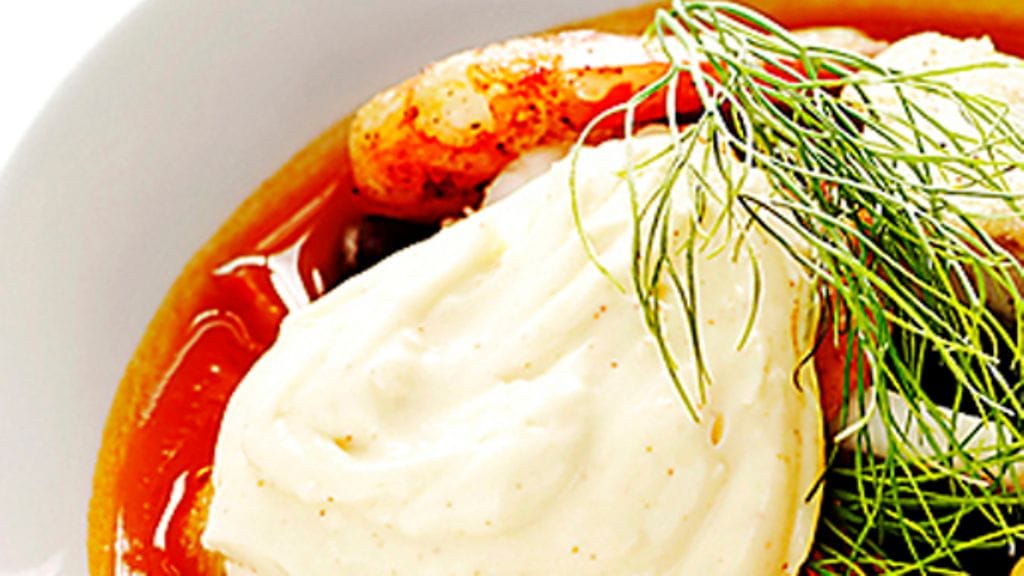 2. Laita aioli kulhoon ja purista joukkoon valkosipulinkynsi. Sekoita mukaan ranskankerma, suola ja kajenne. Pane kylmään tarjoiluun asti.