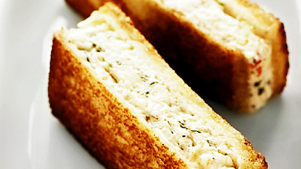 1. Ota voi esiin hyvissä ajoin niin että se ehtii lämmetä huonelämpöiseksi ennen toastin paistamista. Paloittele äyriäiset pienemmiksi paloiksi. Sekoita tuorejuusto ja juustoraaste, kääntele mukaan äyriäiset, tilli, ruohosipuli ja sitruunamehu. Mausta suolalla ja pippurilla.