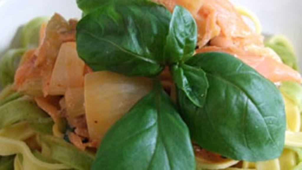 Kaada ruokakerma ja suikaloitu kylmäsavulohi pannulle mukaan. Keitä tuorepasta nopeasti toisessa kattilassa, valuta ja lisää se kastikkeeseen.