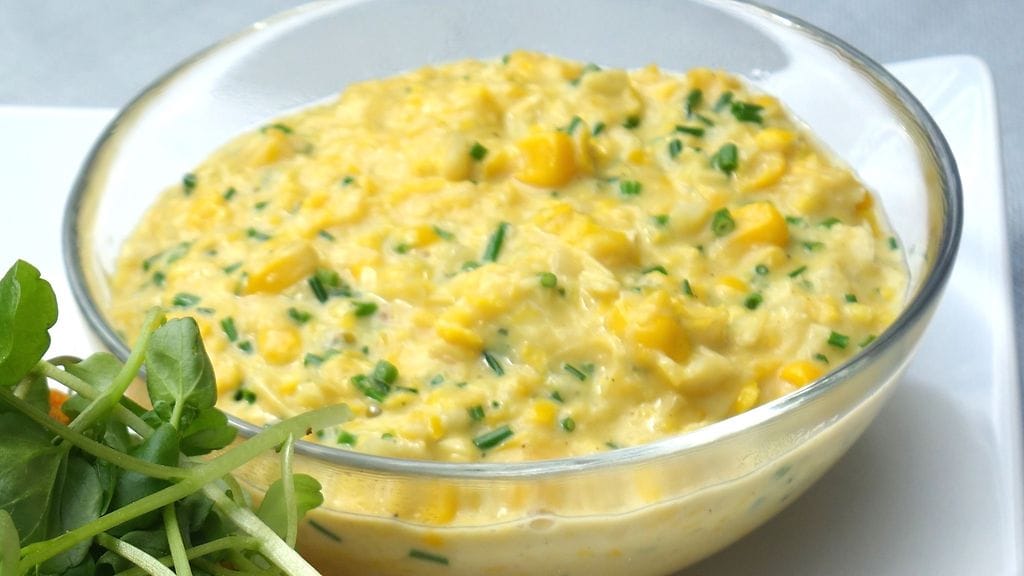 Kuullota sipulit kevyesti voissa. Lisää maissi, Balsamicoa ja kermaa. Keitä 5 minuuttia ja soseuta sauvasekoittimella rouheiseksi. Aateloi maissimuhennos ruohosipulilla.