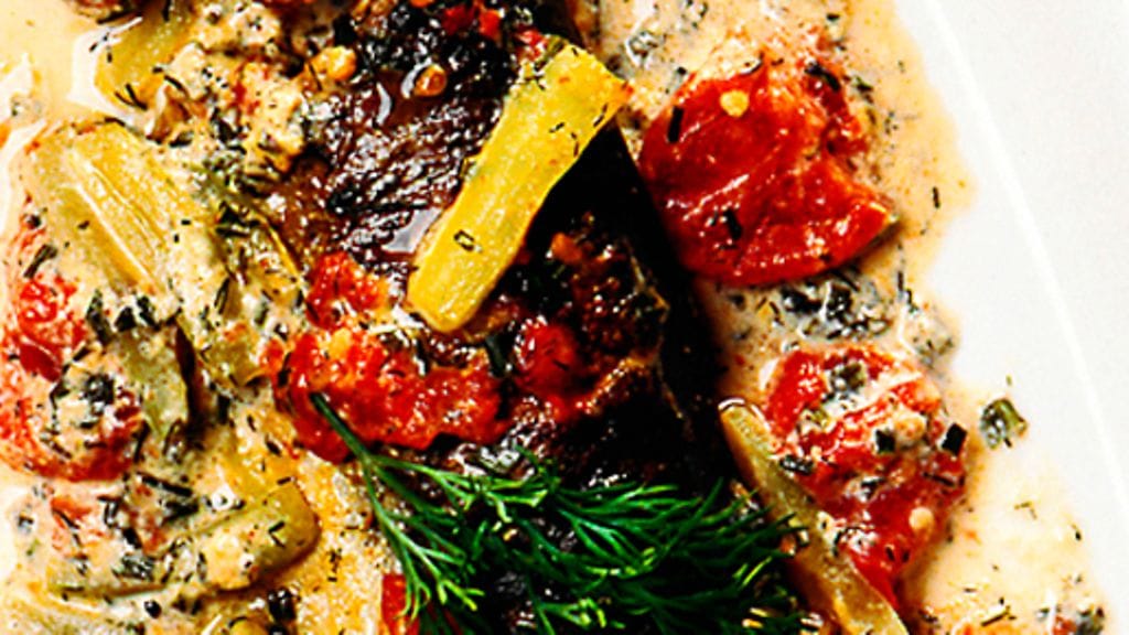 1. Kuumenna uuni 200 asteeseen. Kalttaa tomaatit, puolita ne, koverra pois siemenet ja kuutioi malto. Kuori ja leikkaa kurkku ohuiksi parin sentin pituisiksi tikuiksi. Ota erilleen muutama tillintupsu koristeeksi ja silppua loput tillit sekä ruohosipulit.