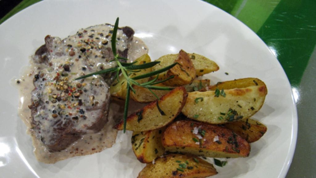 Mausta pihvit suolalla ja pippurisekoituksella paiston aikana. Kaada pannuun kerma ja kuumenna nopeasti. Nosta pannu liedeltä ja anna vetäytyä hetken ennen tarjoamista.