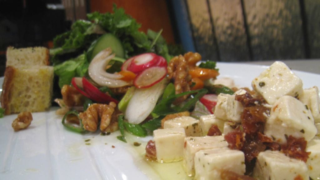Nypi kirveliä salaatin mausteeksi ja sekoita pähkinät sen joukkoon. Roiskuttele balsamicoa ja oliiviöljyä mukaan ja sekoita salaatti hyvin.