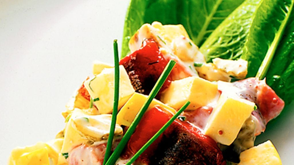 2. Sekoita ainekset keskenään ja kääntele mukaan majoneesi. Maista suola ja llisää tarvittaessa sekä ripaus pippuria. Anna salaatin vetäytyä viileässä ennen tarjoilua.