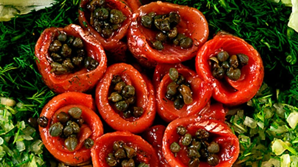 1. Halkaise fileet pituussuuntaan. Kääri ne rullalle ja laita vadille. Asettele muut ainekset ympärille, sekoita sipuli ja ruohosipuli. Täytä sillit kapriksilla. Tarjoile kuuman voisulan ja uusien perunoiden kera.