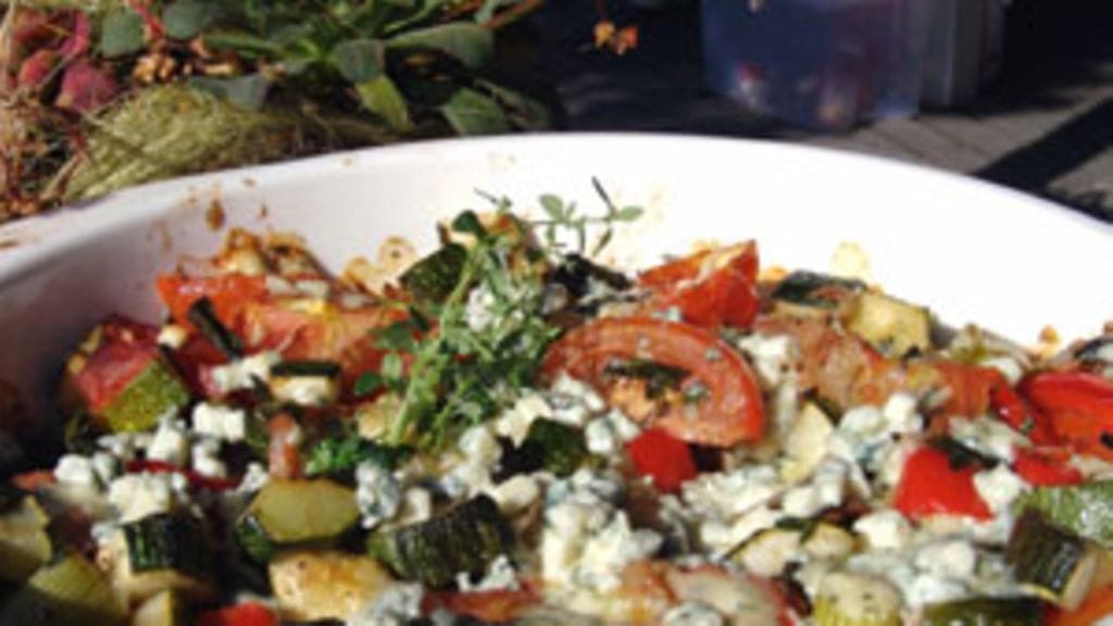 Leikkaa ensin kurpitsa parin sentin kuutioiksi ja ripottele niiden päälle suolaa. Suola alkaa imeä itseensä nestettä ja maustaa samalla kuutioita. Kuutioi tai suikaloi sitten pekoni ja käristä sitä erillisellä pannulla tai grillin parilatasolla. Lisää tsukkinit ja hetken kuluttua loput, paloitellut kasvikset. Mausta seos viipaloidulla valkosipulilla, timjamin lehdillä ja mustapippurilla. Lusikoi paistosta sitten annosvuokiin tai jätä pannuun ja ripottele pinnalle reilusti raastettua sinihomejuustoa. Varmista, että astia kestää riittävästi lämpöä ja aseta se kuortumaan grillikuvun alle, lämmön ollessa täydellä teholla. Syö sellaisenaan, leivän tai pastan kanssa.