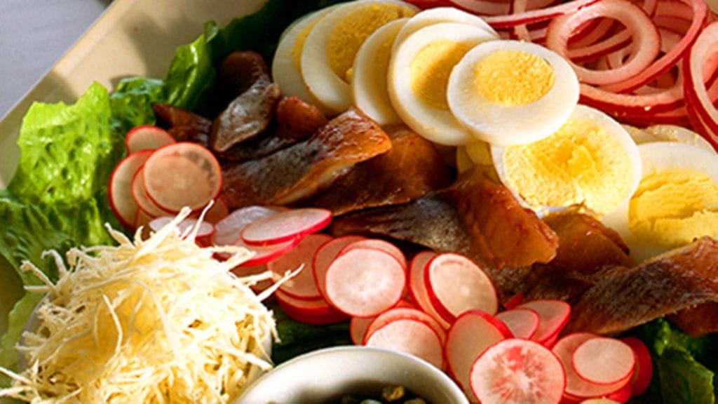 2. Pohjusta tarjoiluvati salaatinlehdillä. Asettele niille sipuli, kananmuna, silli ja retiisi jokainen omana ryhmänään. Laita piparjuurta ja kapriksia pieniin kulhoihin. Näin pitkälle voit valmistella ruoan. Säilytä muovikelmun alla jääkaapissa tarjoiluun asti.