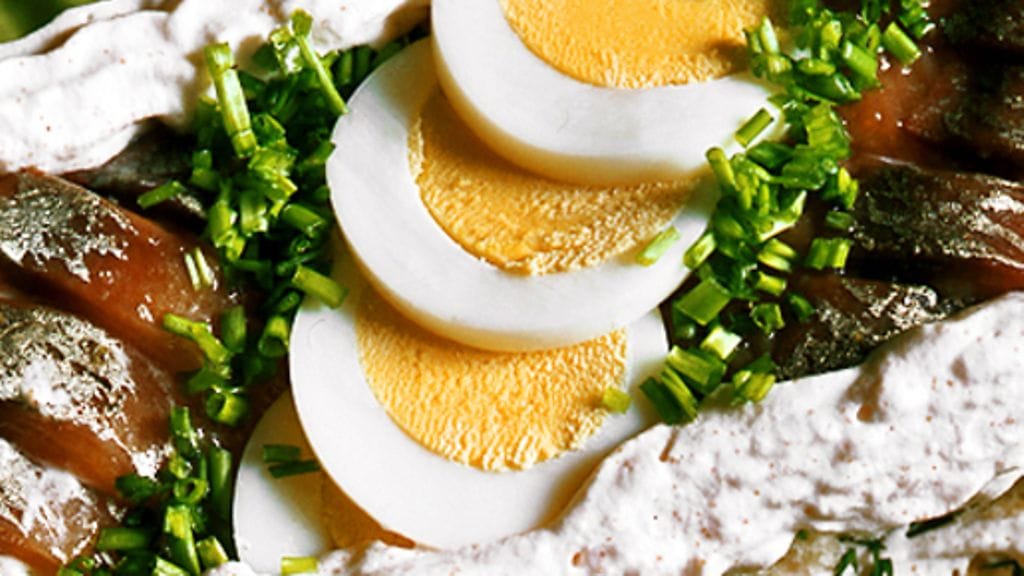 5. Koristele kakku ohuiksi suikaloiduilla sillipaloilla, viipaloiduilla kananmunilla sekä hienonnetulla puna- ja ruohosipulilla. Pursota loput kermasta kauniiksi reunukseksi.