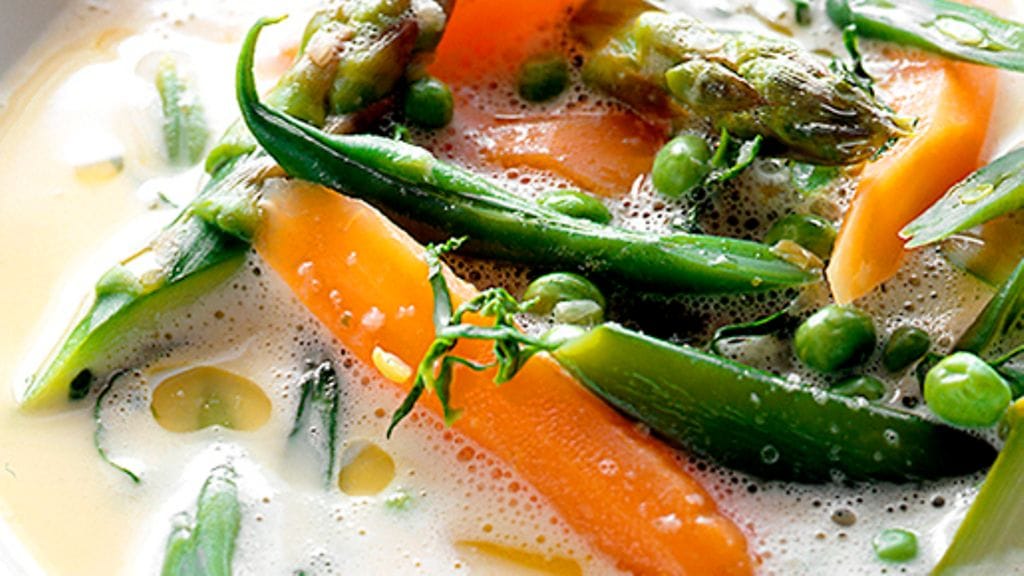 2. Kuumenna vihannesliemi kiehuvaksi. Lisää porkkanat, pavut ja parsat ja keitä 8 minuuttia.