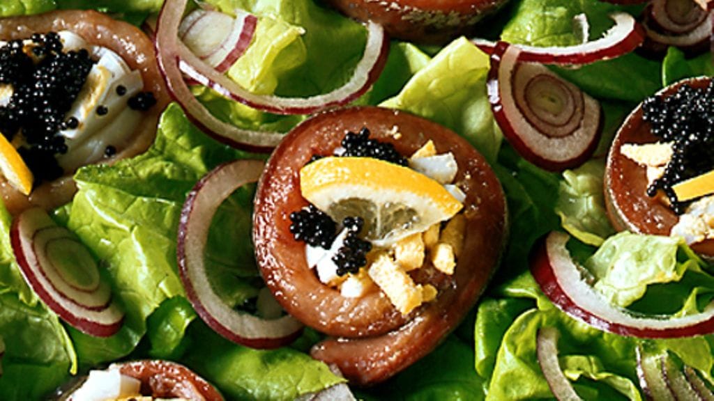 3. Täytä sillirullat hienonnetulla munalla sekä kaviaarinokareilla.