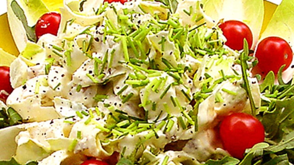 2. Sekoita majoneesi, kermaviili, ruohosipulisilppu ja pyörittele perunakuutioiden ja endiivisilpun joukkoon. Mausta salaatti huolellisesti mielellään merisuolahiutaleilla ja mustapippurilla suoraan myllystä.