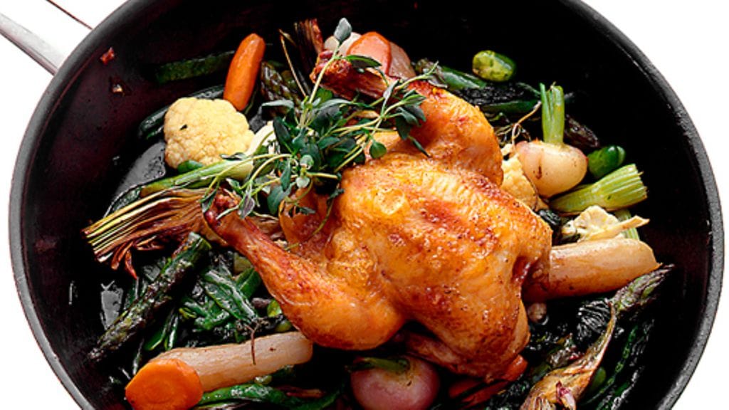 2. Lado kaikki vihannekset uunivuokaan, jonka pohjalla on tilkka vettä. Nosta maustettu kananpoika niiden päälle ja laita muutama voinokare linnulle. Laita vuoka uunin keskitasolle noin 45 minuutiksi. Kokeile tikulla, milloin kananpoika on kypsä; lihanesteen pitää olla täysin kirkasta.