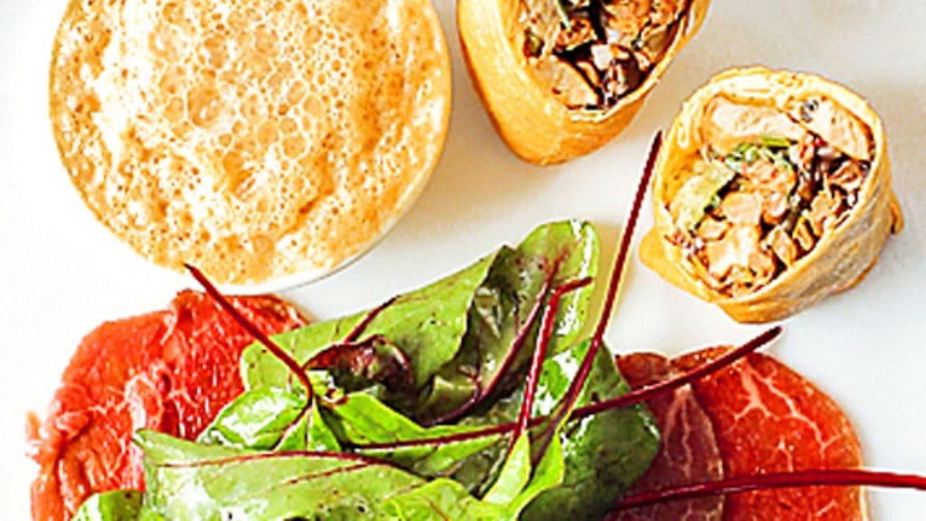 7. Viipaloi graavattu häränfilee paperinohuiksi viipaleiksi, tämä käy helpoiten koneella, jos filee on pakastettu. Tarjoile sienikeiton ja vastafriteeratun kevätrullan kera.