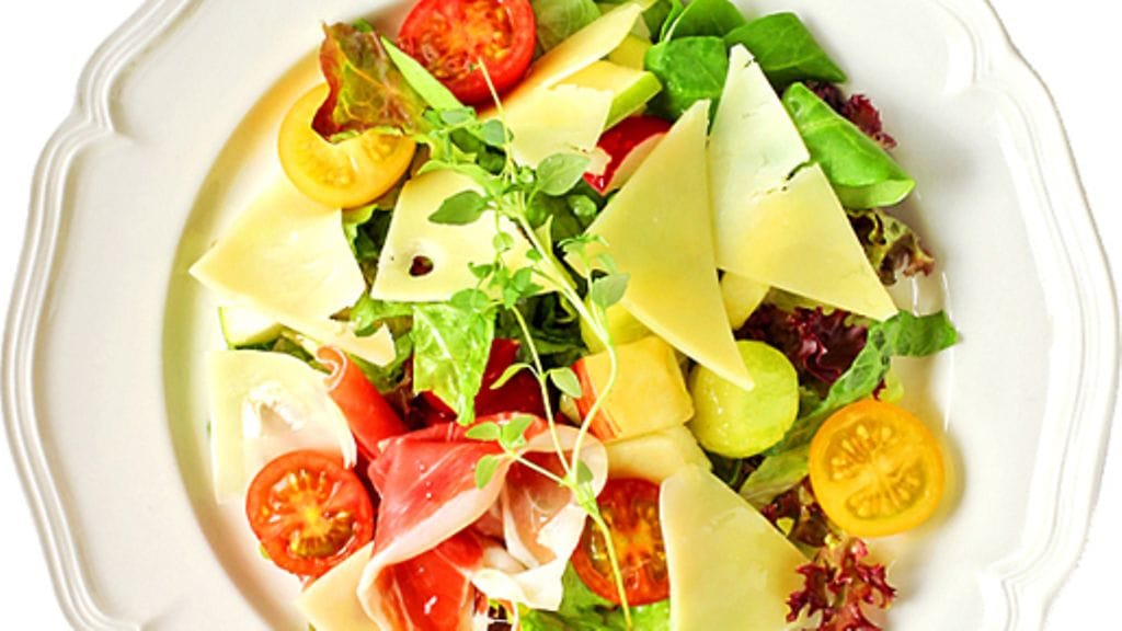 3. Huuhdo salaatinlehdet ja revi ne pienemmiksi paloiksi. Jaa salaatti neljälle lautaselle. Jaa melonisekoitus salaatin päälle ja kaada kastike päälle. Aseta päälle kaksi parmankinkkuviipaletta joka lautaselle, leikkaa juusto ohuiksi viipaleiksi ja asettele päällimmäiseksi.